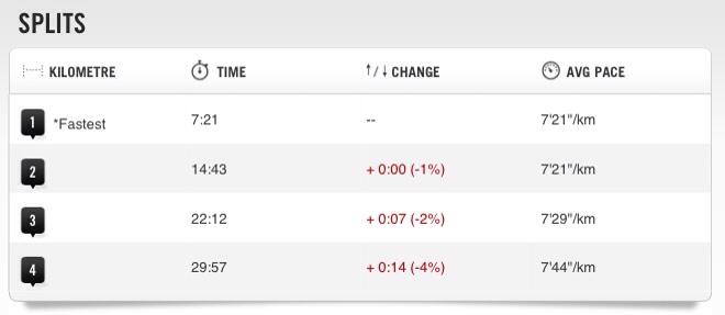 Looking at my splits for this run I am amazed that two of my km's were identically timed. This proves to me that this is a much better way to get my pacing right. 🙂