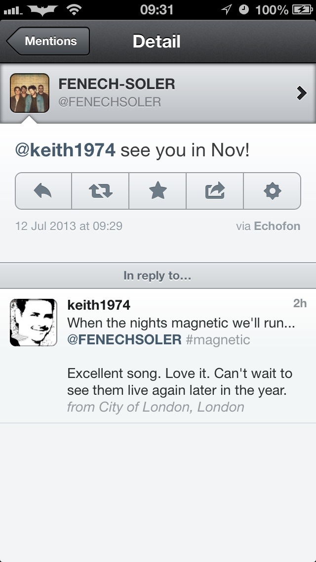 Chuffed the boys from Fenech Soler acknowledged my tweet 😃 Share: Share on WhatsApp (Opens in new window) WhatsApp Share on LinkedIn (Opens in new window) LinkedIn Email a link to a friend (Opens in new window) Email Share on Bluesky (Opens in new window) Bluesky Like Loading... Related