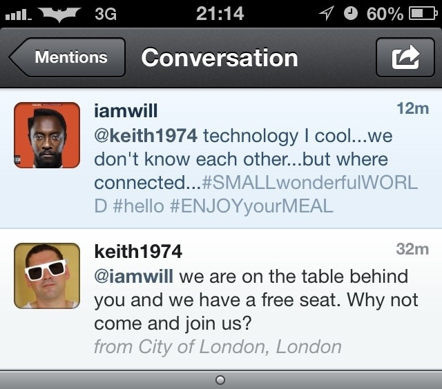 We were all a bit giddy so I decided to tweet to as him to join us as we had a spare seat and he was sat alone…