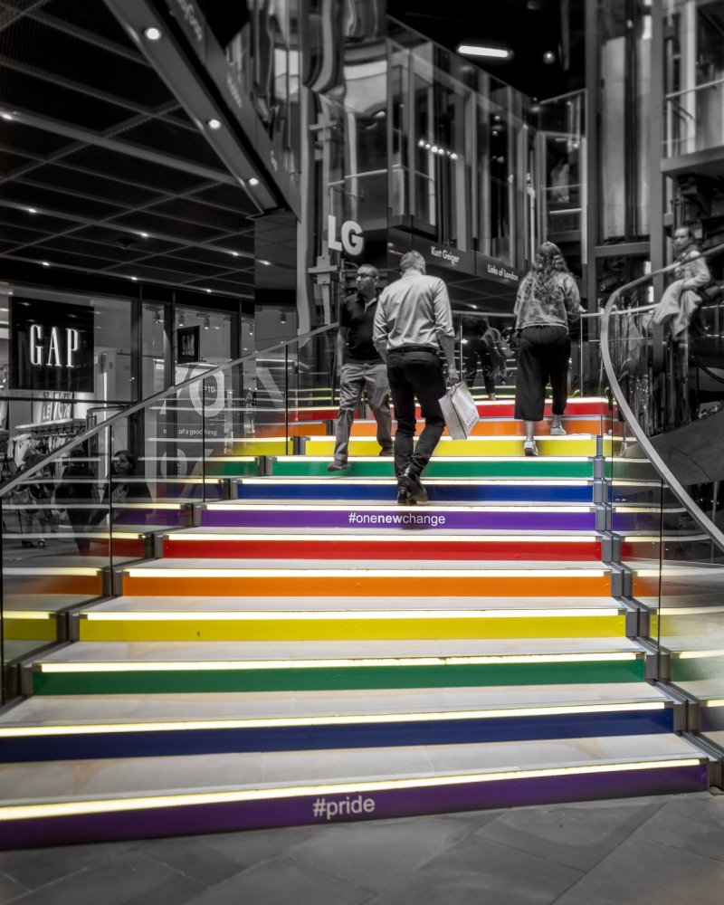 The staircase in One New Change at St Paul’s has been given the rainbow treatment. It adds a nice pop of colour to this drab, grey city space.