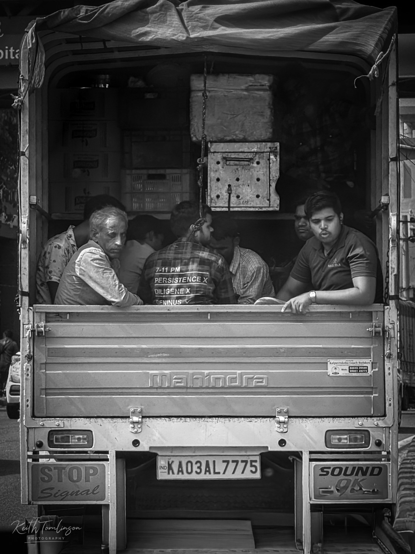 The Mahindra truck, the Karnataka number plate, the weathered metalwork, the older man on the left holding a steady, unflinching gaze — it all comes together into something that feels very specifically Bengaluru. Busy, layered, quietly compelling.